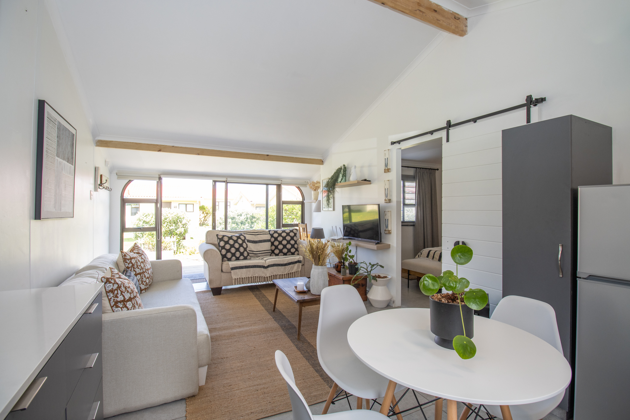 Sink into two inviting soft sofas with their eye-catching cushions and watch a bit of Netflix. One of these folds out into a sleeper couch, as an extra bed, if need be. Shiny tiled floors are warmly covered with natural woven rugs, offsetting soft greys, charcoals, honey browns, blues and beige hues. It’s a homely, smart cottage with an earthy beach scene, green pot plants and retro wooden furnishings.