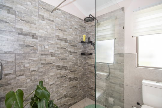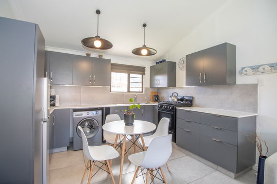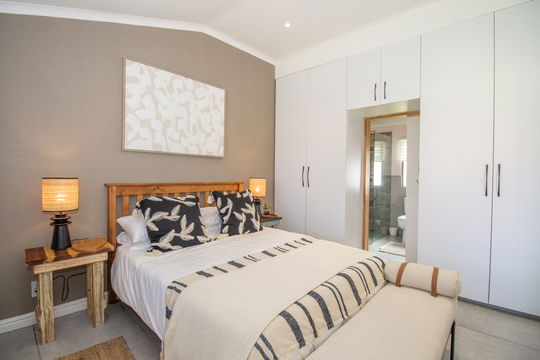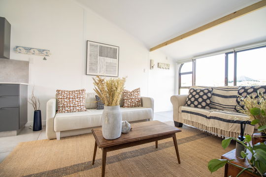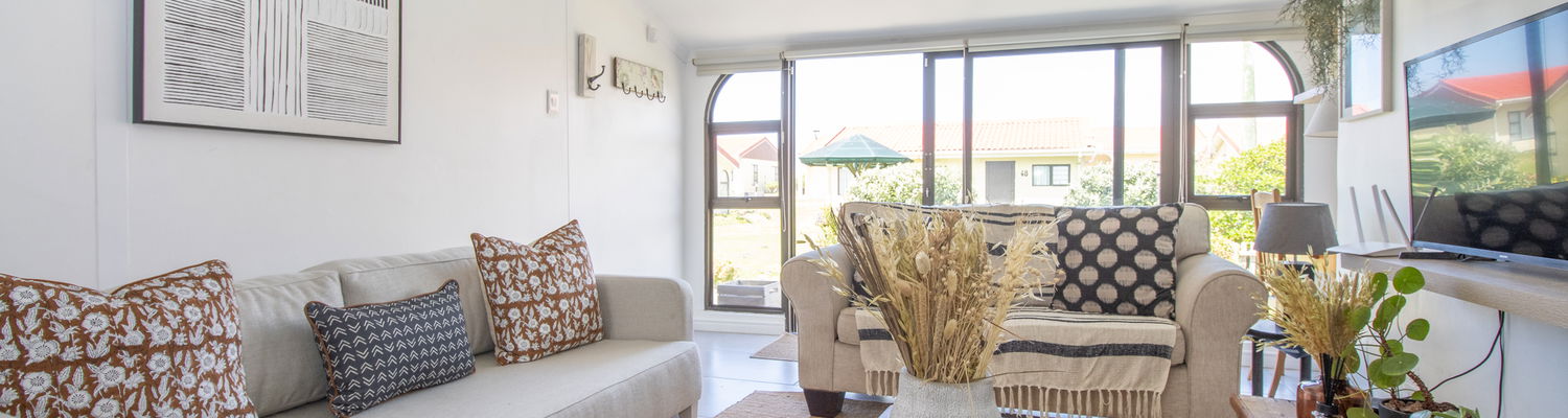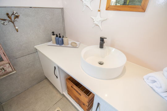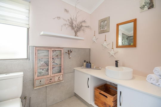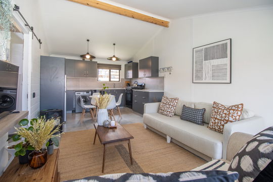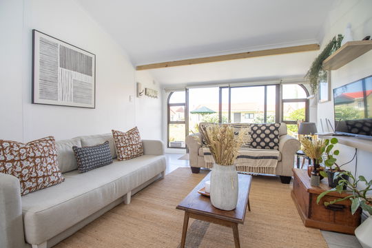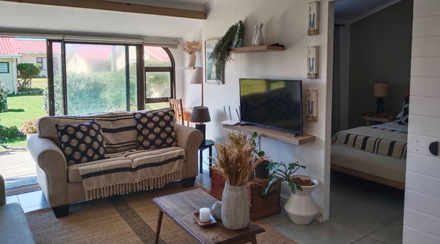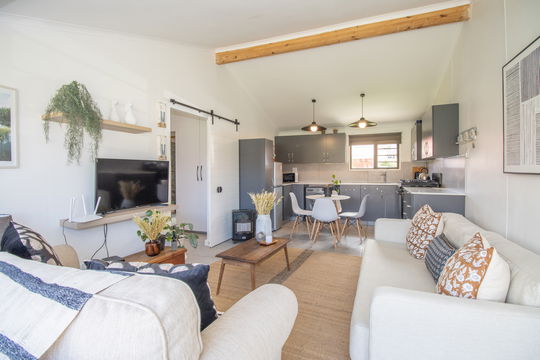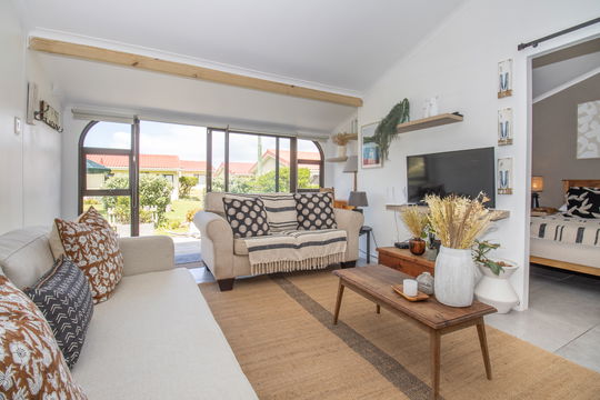 Entering this cozy cottage is like walking into a premier hotel villa somewhere in Europe. Quality décor and furnishings ensure top-class comfort in a space made for tasteful holiday relaxation. Discover a warm, elegant cottage where interlinking rooms add natural space and flow to the main living area. Everything feels homely and smart at the same time. Serene hues of beige, cream, deep blue and soft brown decorate the lounge, kitchen and bedroom. Stunning woven carpets cover the floors, offsetting the earthy beach scene. Sink into two expansive sofas with their tasteful plush cushions and watch TV. Or rest on the firm double bed, fitted with beautiful linens and throws. Modern art, green pot plants and retro wooden furnishings enhance the peaceful interior. Guests love the contemporary bathroom with its walk-in modern rain shower boasting rustic tiled walls, a round basin and stylish beach décor. Discover toiletries, fluffy towels and plenty of cupboard space for long summer vacations. The spotless modern kitchen and dining area has been created for private self-catering bliss.