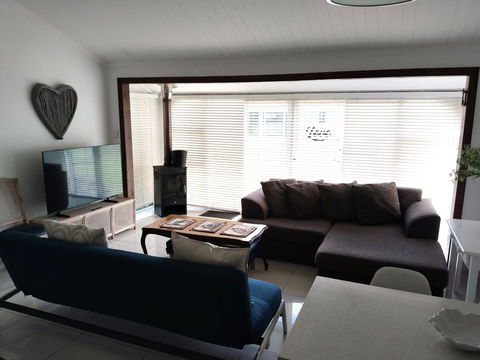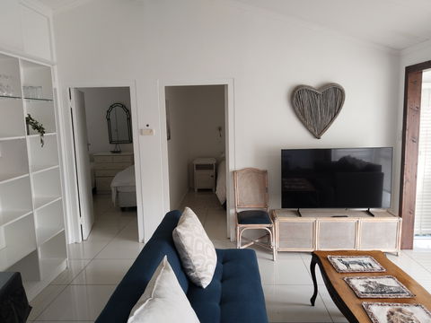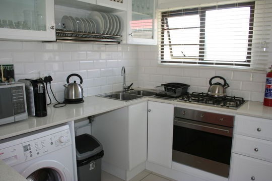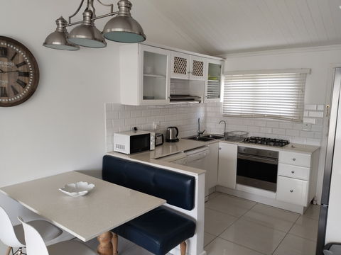 This bright modern cottage is perfect for friends and families. It comfortably sleeps four people in two elegant bedrooms featuring 1 queen bed and 2 single beds in restful shades of white, blue and green. Perfect for cold wintery days, it boasts its own indoor wood-burning fireplace to stave off those typical Cape storms. Gather in the cosy lounge with its ample sofas and watch Netflix together. Cool tiled floors for summer and a short walk to the beach. A bathroom with a shower and a kitchen with a microwave, a stove and a washing machine. Set in a pretty garden with mountain views and plenty of birds.