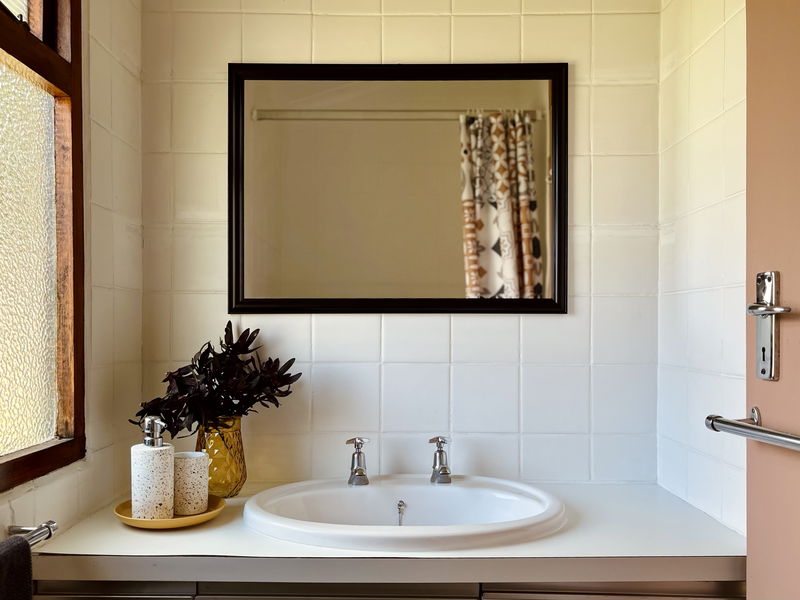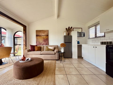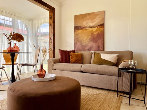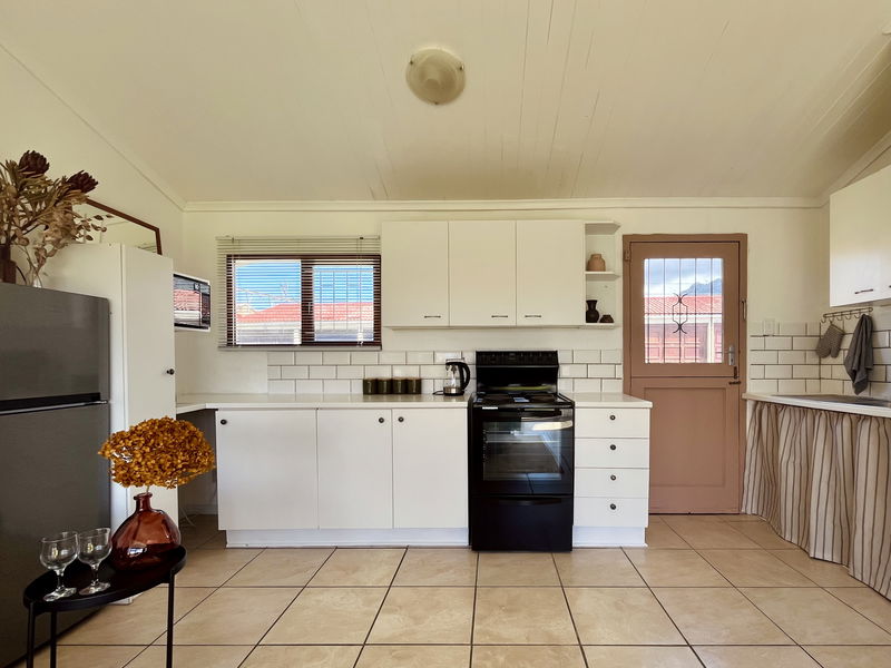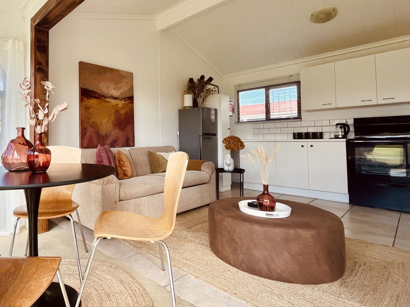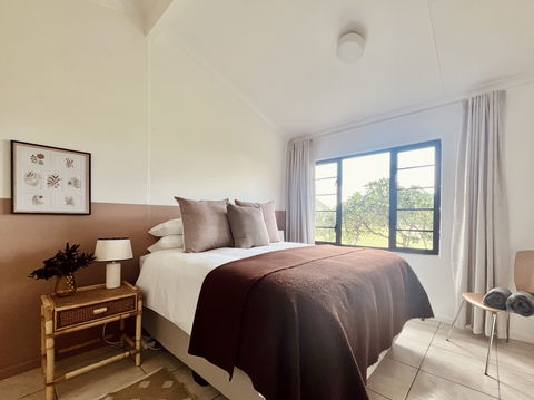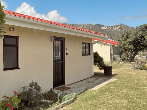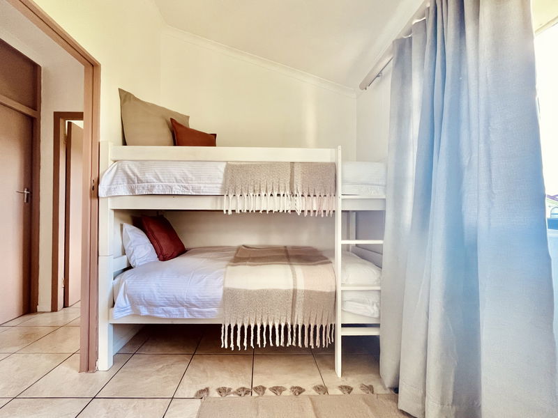Feel delighted to stay in a beautiful addition to the Seaside Cottages family. This cute 2-bedroom, 1-bathroom cottage is perfect for a family of four. There is a fun bunk bed in one room, while the main bedroom offers a comfy double bed with beautiful linens. The restful open-plan living area boasts soft beige, rusty orange and chocolate-brown decor. A vast sofa, quality dining furnishings, and ethnic woven rugs thrown over glossy tiled floors add pizzazz. There is a TV, but bring your own login for DSTV and Netflix. Step outside onto lush green grass and stroll directly to the beach.