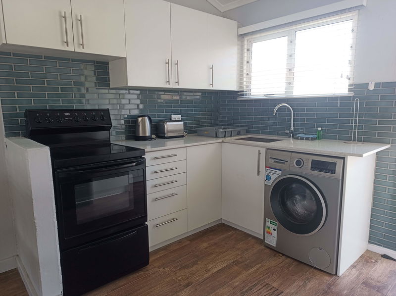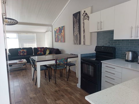A spacious, neat cottage recently renovated and refurbished with a modern Afro-chic flair. Striking black and white portraits showcasing Africa's wonderful wildlife, funky ethnic chairs and a pineapple on the wall! The welcoming cottage comfortably sleeps 4 guests (4 single beds with comfortable new mattresses and linen can be converted into two singles and a King.) The warm laminate floors mimic real wood and complement the coffee table. Guests love the beaded mounted buck trophy and birds watching over their movements. Get lost in the Cape Town BoKaap street scene painting while relaxing on the soft charcoal L-shaped sofa. The large wall-mounted flat-screen TV with DSTV is included. Prime location opposite beach access pathway!