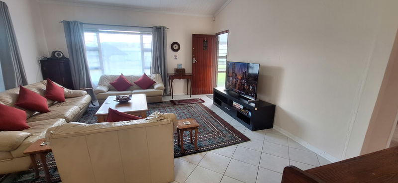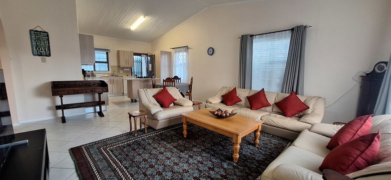 Ideal for happy holiday gatherings, the open-plan living and dining area overlooks a lush, bright garden. Ample cream couches decked with red cushions invite chill time in front of the large Smart TV. A plush carpet adds a splash of colour, while bedrooms feature plenty of cupboard space and quality linens.